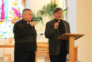 Aluekoordinaattori Tapani Kaitainen Kansanlähetyksestä muistutti, että vähemmistökirkossa koulutuksen merkitys on erittäin suuri, sillä se kasvattaa, varustaa ja kehittää kirkossa palvelevan työntekijäidentiteettiä. Teologisen Instituutin entinen rehtori Tapio Karjalainen (kuvassa oikealla, vasemmalla Vladimir Dorodny) muisteli lämmöllä Kelton työvuosiaan ja hyviä työtovereitaan. Muista oppilaitoksista tervehdyksiä esittivät Herzenin yliopiston ja Smolnan instituutin edustajat.